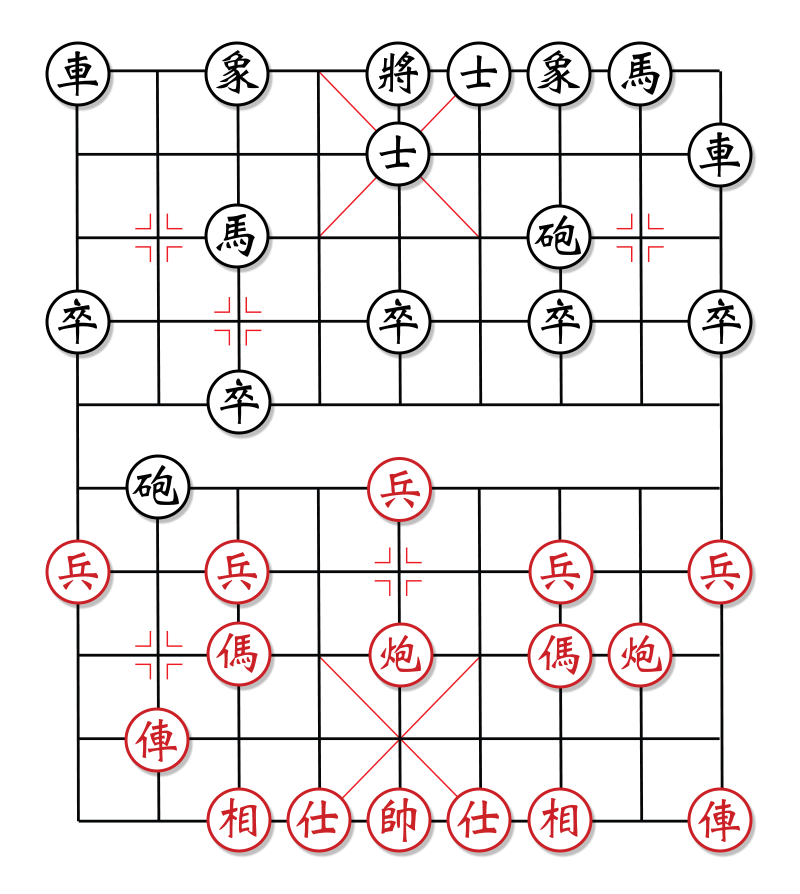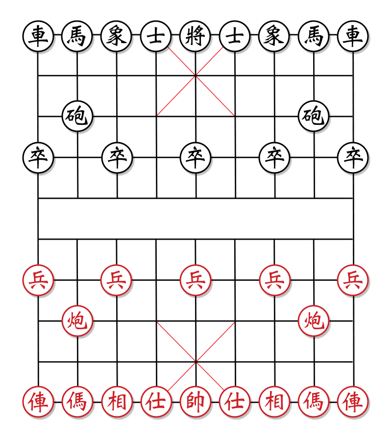 每方共有十六枚棋子。整支军队由五个兵、一个将(帅),以及各两枚其他类型的棋子组成。传统上,棋子上会标注对应的汉字。双方使用的字形略有不同,但棋子的功能完全相同。
